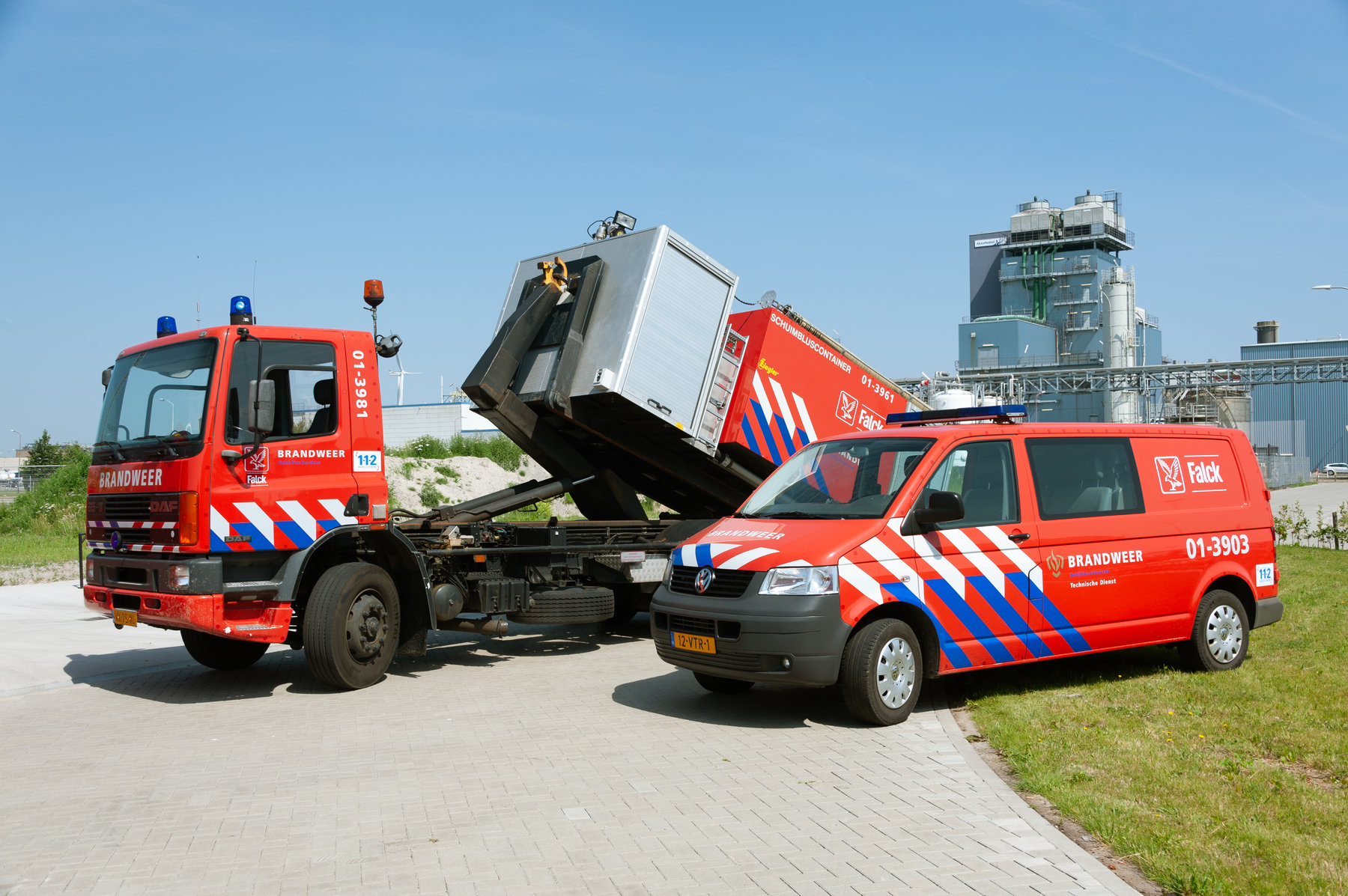 De reden hiervoor is dat het schuimblusvoertuig, dat op de eerste uitruk staat, voor onderhoud of bij storing direct kan worden vervangen door deze combinatie. Op deze wijze is de veiligheid nog beter gewaarborgd. Voor het verrichten van de ademluchtwerkzaamheden op de site heeft Falck een Volkswagen Transporter aangeschaft. Deze wordt voorzien van rekken om de ademluchtflessen op een veilige wijze te vervoerden.