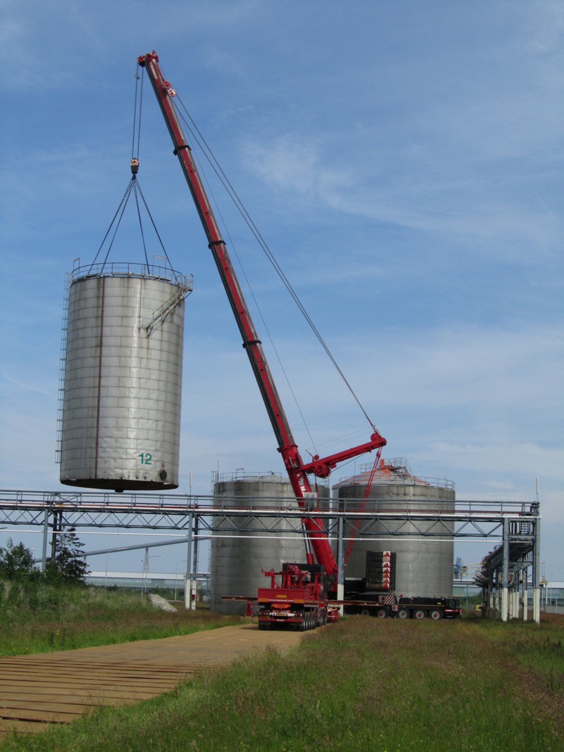 Vier tanks van 28 meter hoog werden in Noord-Holland gebouwd en daarna naar de site vervoerd. De grootste tank van 7200 kuub werd ter plekke gebouwd door eerst het dak te bouwen en er vervolgens telkens een ring onder te bouwen. De bouw werd deze maand afgerond.