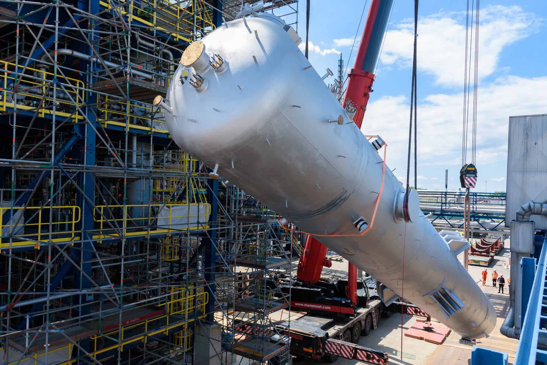 Na maandenlange voorbereidingen werd namelijk de nieuwe crystallizer uit Spanje geïnstalleerd. Daartoe werd de 25 meter hoge en 84 ton wegende kolom nauwkeurig ingehesen op de daarvoor bestemde plek. Heel wat toeschouwers waren hiervan getuige. “Een mooi stukje hogeschool-hijswerk”, aldus projectmanager Ard van den Bosch. “De klus nam flink wat tijd in beslag, omdat het zorgvuldig moest gebeuren om de kolom zonder schade op de plek te krijgen.” Momenteel wordt de installatie afgebouwd en na de najaarsstop, medio oktober , in gebruik genomen.