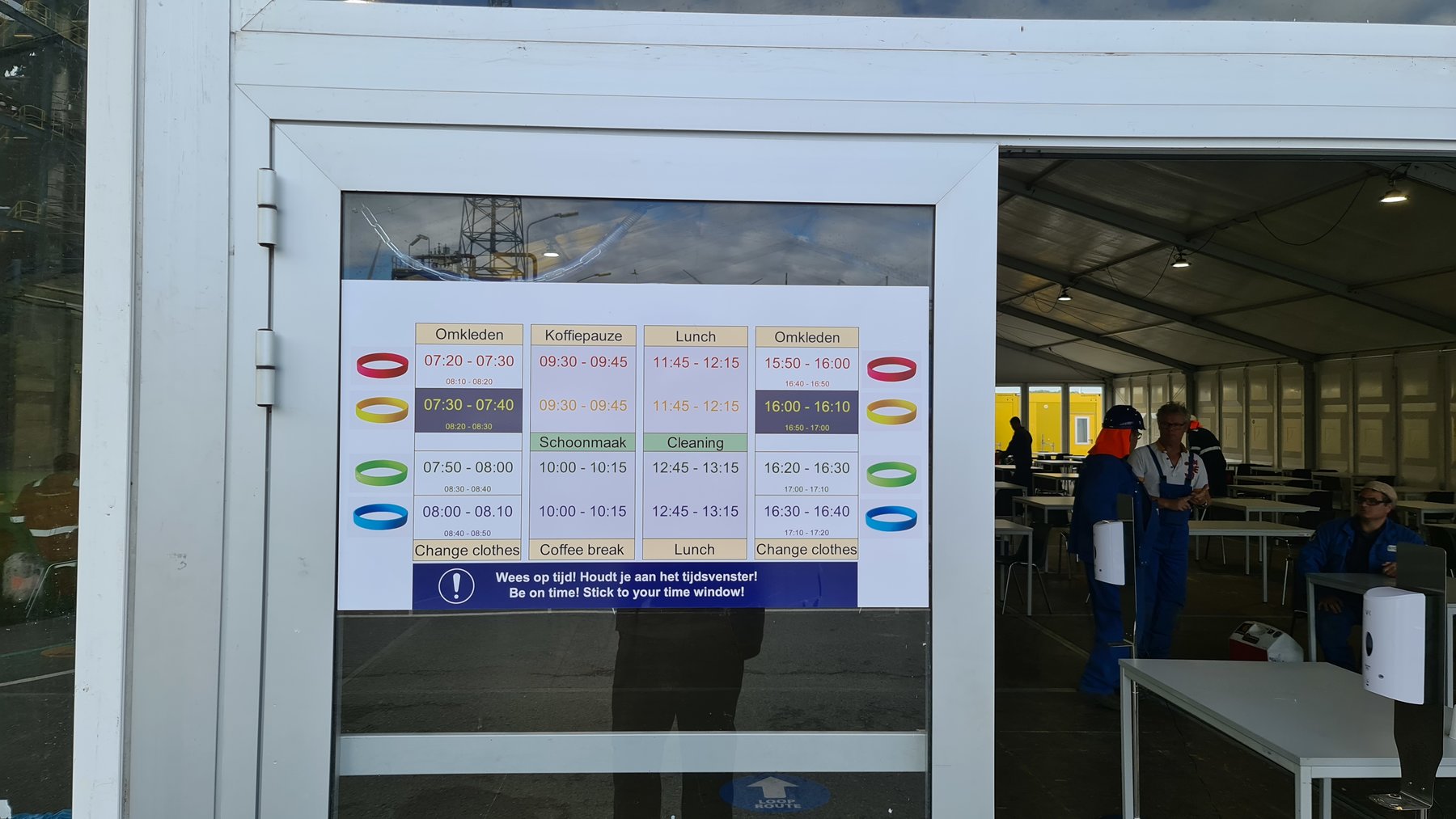 Tijdens het omkleden en het kantinegebruik werd in samenwerking met Stork een systeem met polsbandjes met vier kleuren opgezet. Elke kleur correspondeerde met tijdsloten om zich om te kleden en gebruik te maken van de kantine. De kleuren kwamen terug op alle kledingkasten en waren zo aangebracht dat iedereen met dezelfde kleur zich op ruime afstand van zijn buurman kon omkleden. Daar waar de anderhalve meter afstand niet kon worden gehandhaafd, was het dragen van gelaatsscherm verplicht.