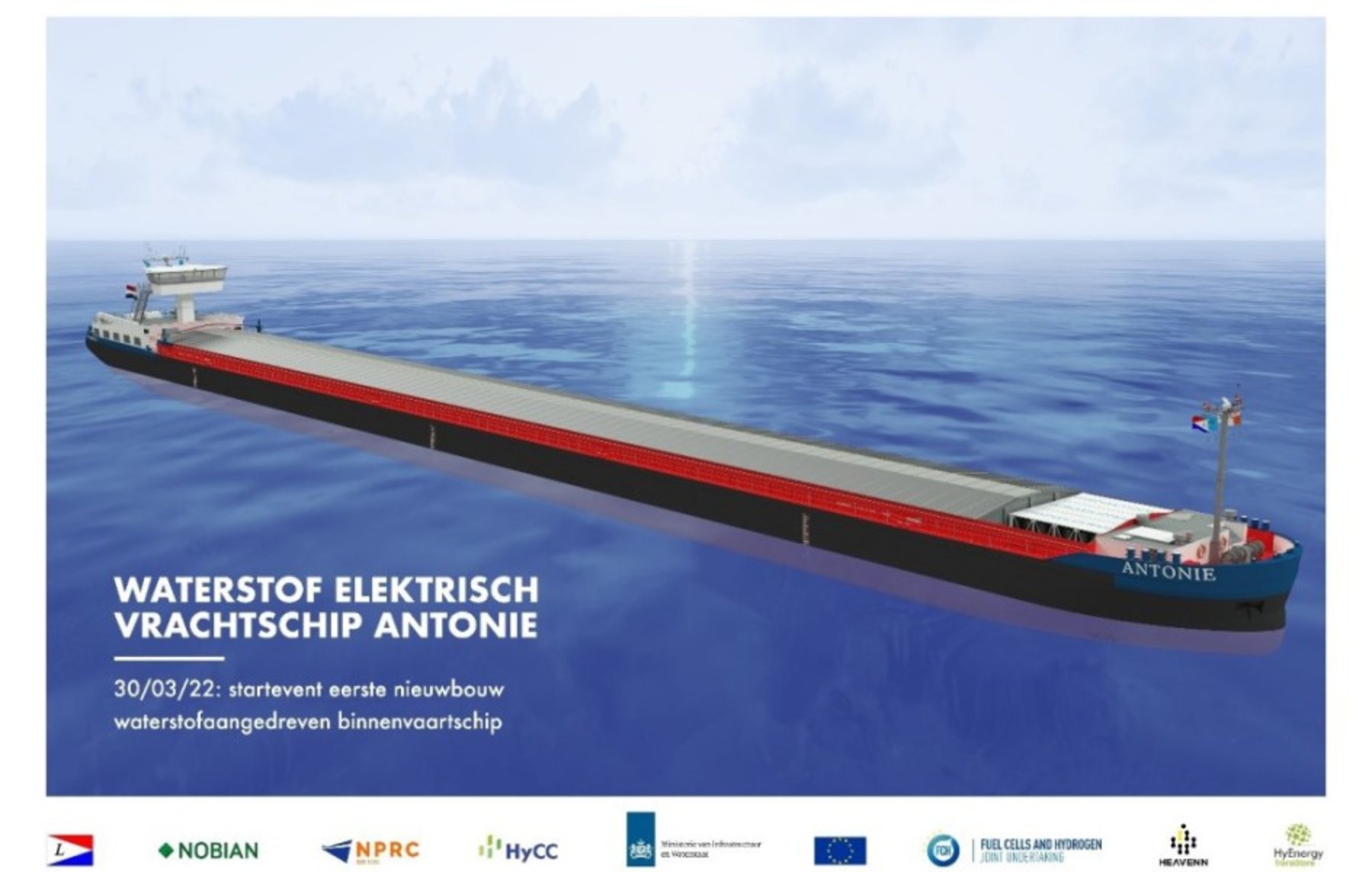 Minister Harbers van Infrastructuur en Waterstaat startte 30 maart officieel de bouw van het ms Antonie, het eerste binnenvaartschip in Nederland dat volledig op groene waterstof zal zijn aangedreven.