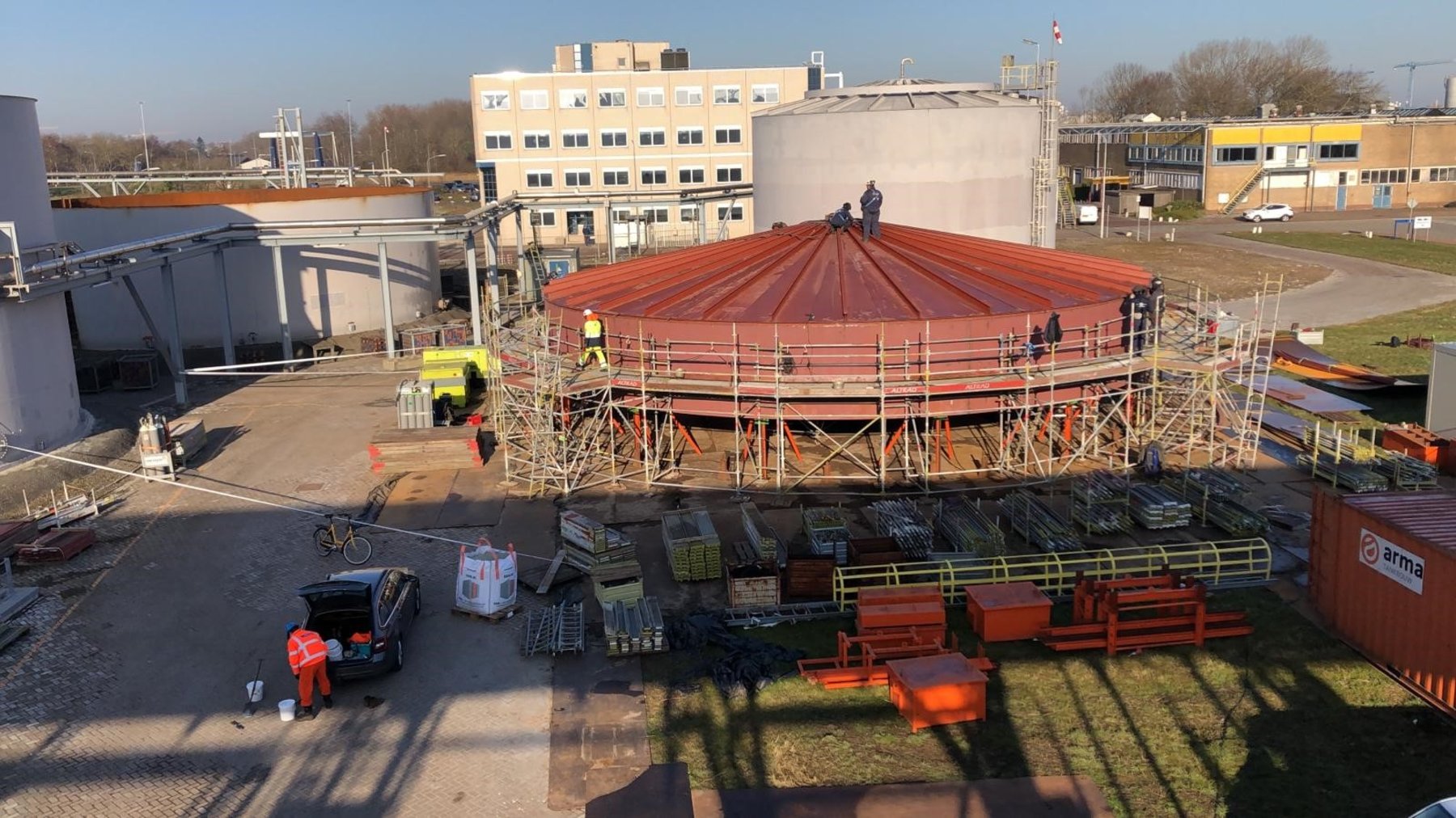 “We hebben het dak van de oude tank gehaald en de wanden ingekort. Noodzakelijk, want anders bestaat het risico dat de ‘dakloze’ tank met een stevige wind in elkaar wordt gedrukt”, legt Paul uit. Het onderstuk wordt gerepareerd en de bodem wordt vervangen, waarna de tank een nieuw bovenstuk met dak krijgt. Een speciale kraan zal het 70 ton zware bovenstuk op de gerepareerde onderzijde plaatsen.