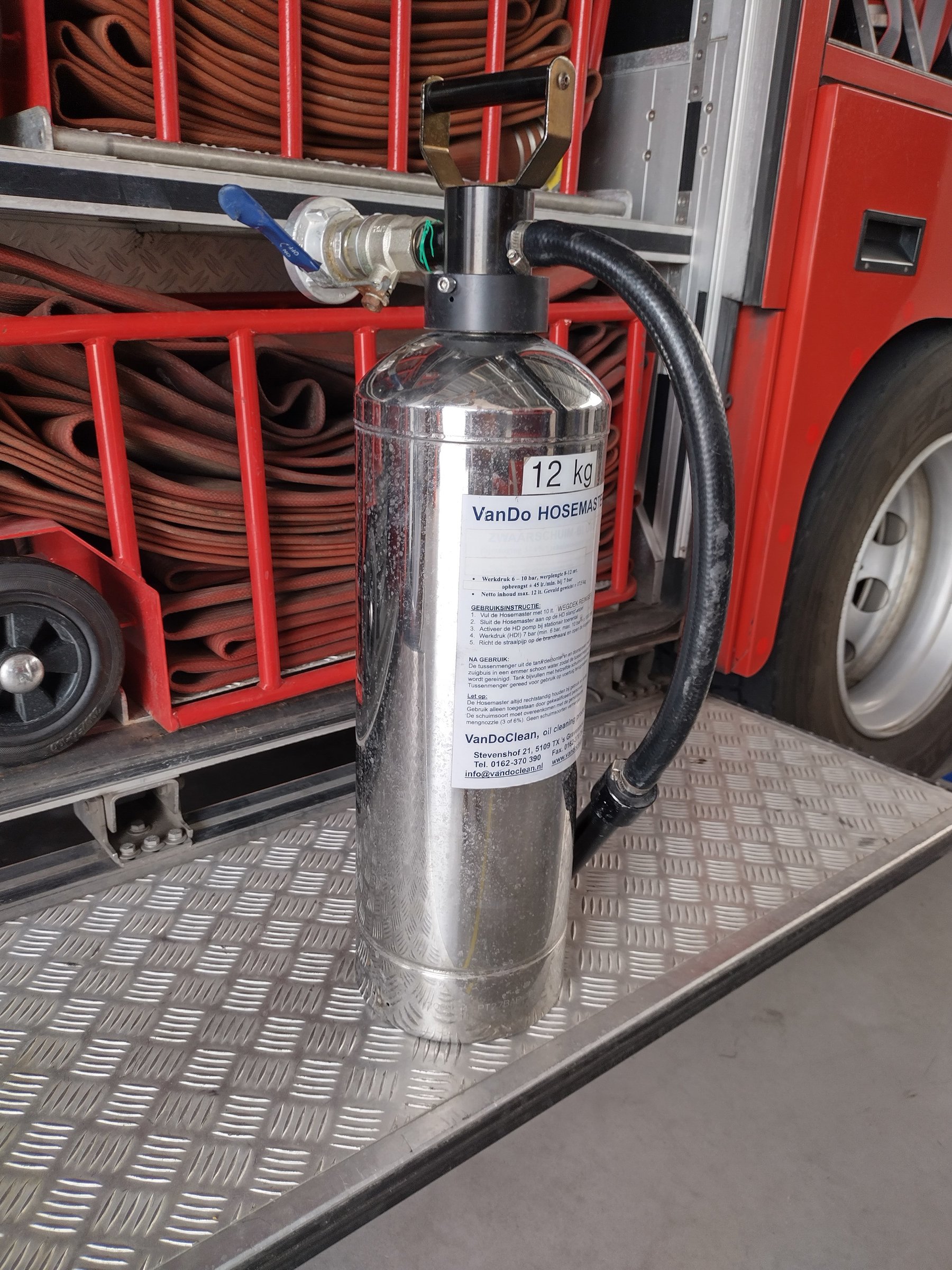 Een Hosemaster, deze lijkt op een grote handblusser, kan ongeveer 15m2 met schuim afdekken. Het opbrengen van schuim op een brandende of uitdampende vloeistofplas heeft een afdekkende werking, waardoor de vlammen zullen doven. “Voor ons als Falck is dit een mooie, eerste kleine stap in de transitie naar fluorvrij”, aldus bevelvoerder Peter Wolthuis.