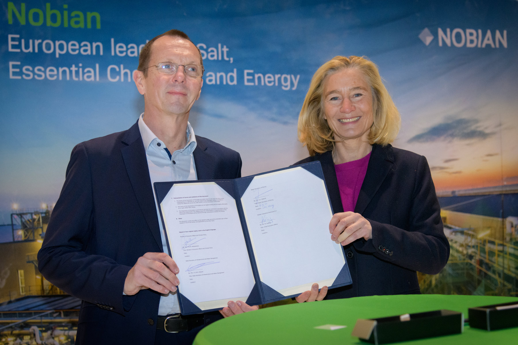 Vandaag ondertekenden minister Adriaansens, van Economische Zaken & Klimaat, en Michael Koenig, CEO van Nobian, een intentieverklaring als onderdeel van de maatwerkafspraken tussen de overheid en grote bedrijven om CO2-uitstoot versneld te reduceren. Naast de minister, ondertekenen ook staatssecretaris Vijlbrief, van Mijnbouw, en staatssecretaris Heijnen, van Infrastructuur en Waterstaat, de intentieverklaring. De overeenkomst past binnen Nobian’s doelstelling om een van de duurzaamste chemiebedrijven van Europa te zijn.