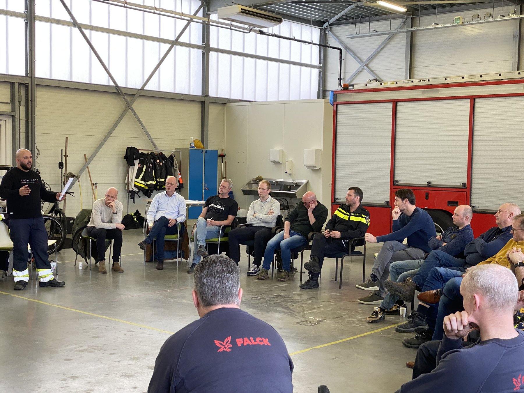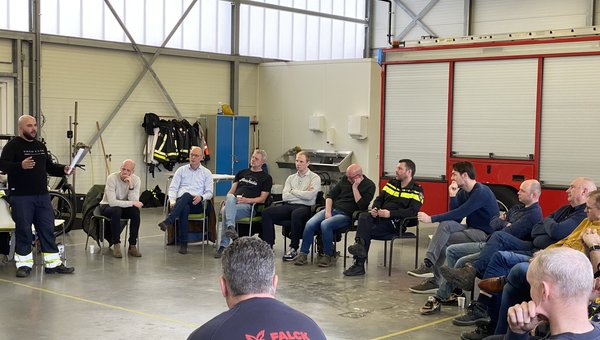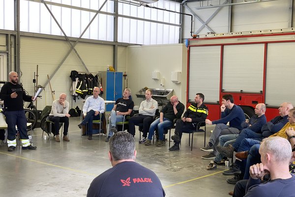 Nobian HSE Specialist Henk Nusmann en Falck locatiemanager Wouter Joostens organiseerden een bijeenkomst voor veiligheidscoördinatoren, bevelvoerders van Falck en Officieren van Dienst van de overheidsbrandweer en de politie. Al met al een groep van ruim twintig personen.