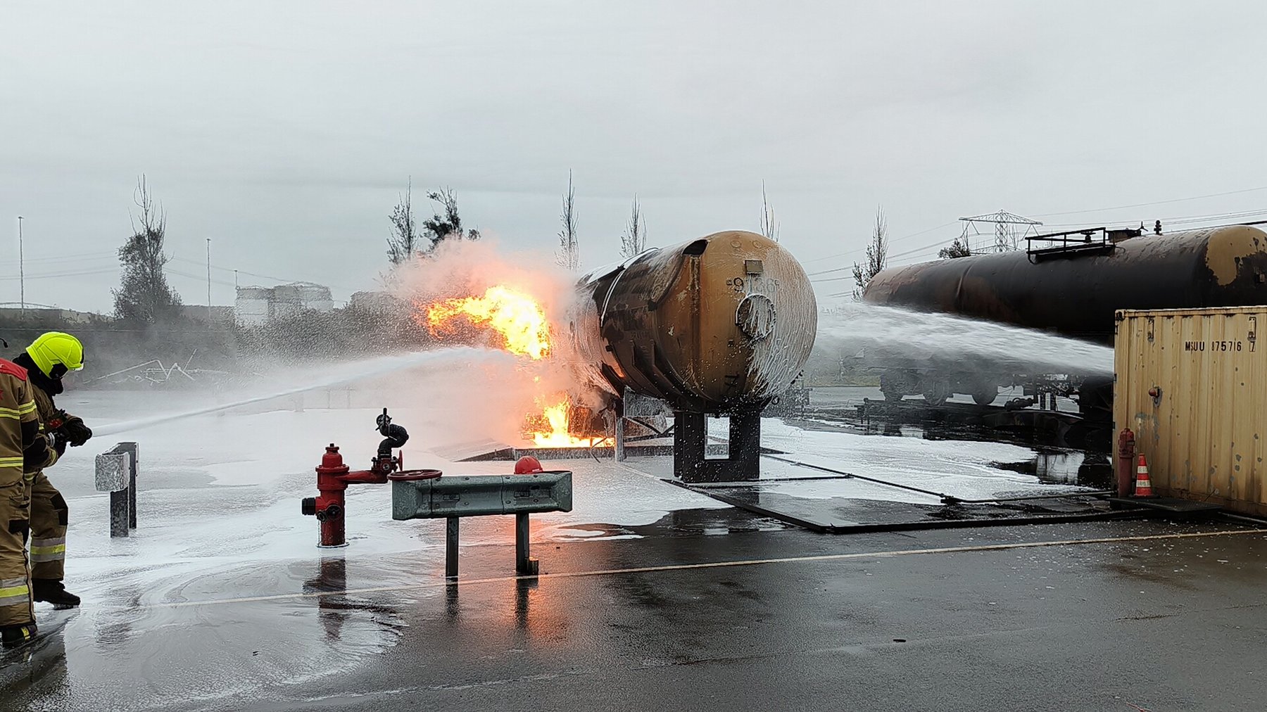 Het aantal locaties in Nederland, waar industriële brandbestrijding realistisch kan worden geoefend, is beperkt. Vandaar dat Falck oefende op het trainingscentrum van RelyOnNutec op de Maasvlakte bij Rotterdam.