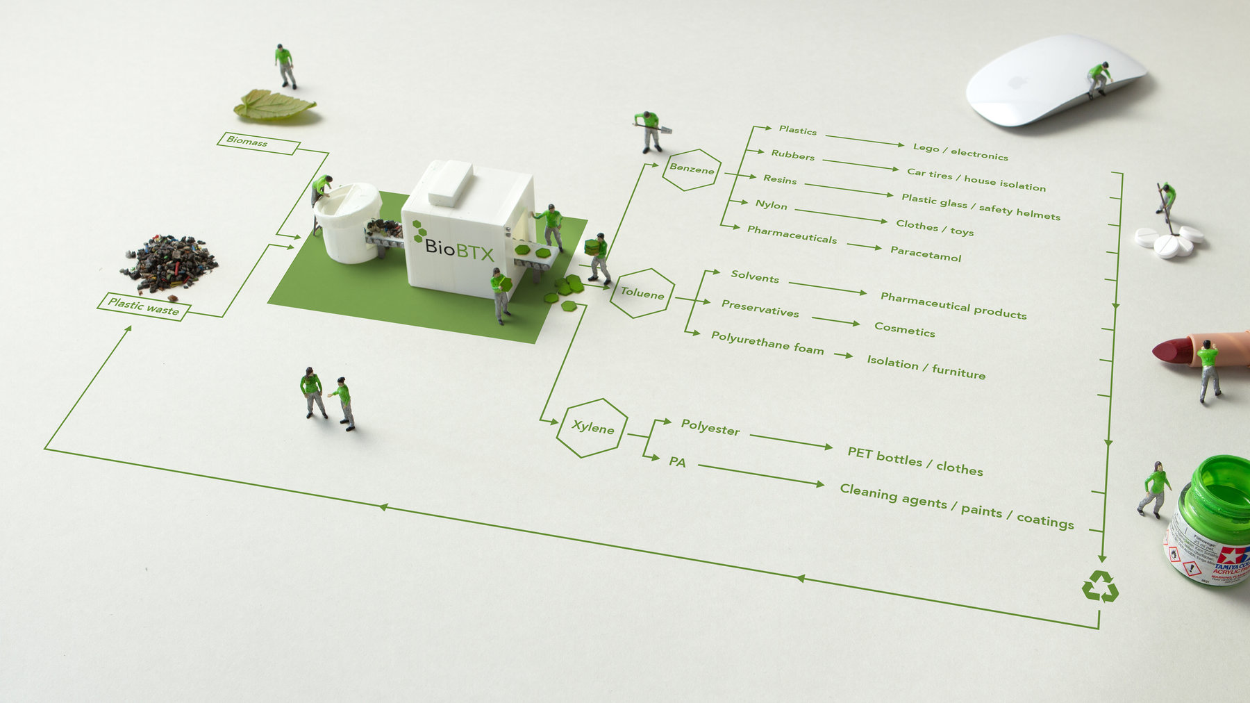 Als pilot richt Circular Aromatics, een initiatief van 23 miljoen euro, zich op het opschalen van een door BioBTX ontwikkelde recyclingtechnologie. Hierbij worden gemengd plastic afval en biomassa omgezet in aromatische verbindingen, zoals benzeen, tolueen en xyleen (BTX) en olefine- en paraffinerijke stromen. Zo wil men circulaire chemische producten maken die kunnen worden toegepast in auto- en vliegtuigonderdelen en in beschermende werkkleding.