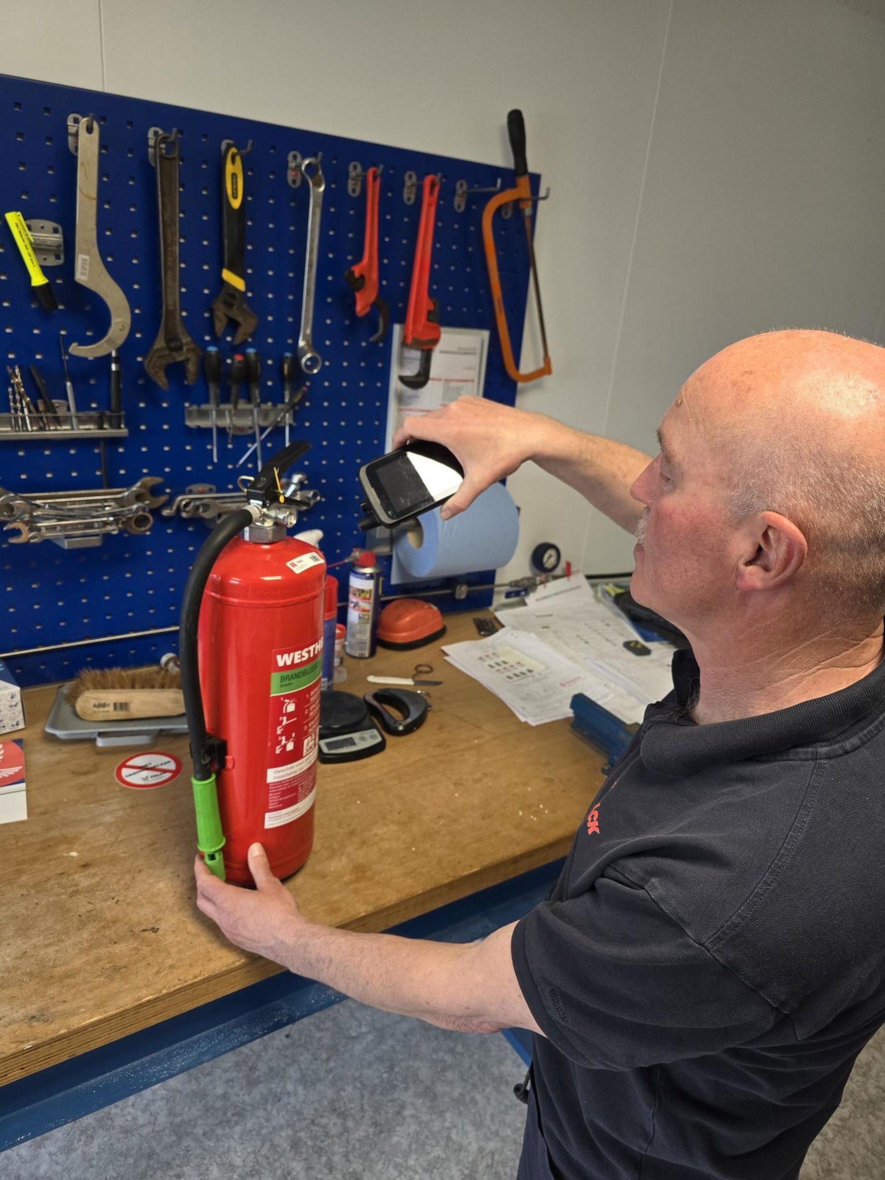 De check gebeurt op de plekken waar ze hangen. Peter: “Dat is best fysiek werk, want sommige hangen buiten in de fabriek, bijvoorbeeld op drie hoog. We checken of de blussers nog voldoen aan de geldende normen, kijken naar de druk en het gewicht en de uiterlijke staat.”